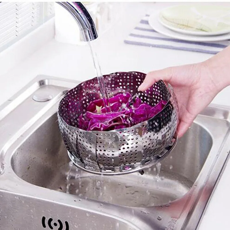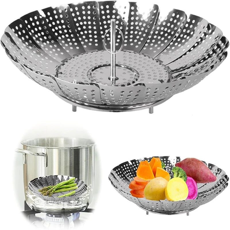 This multifunctional stainless steel steamer plate is designed for versatile cooking. It can be used to steam a variety of foods including rice, fish, dumplings, fruits, and vegetables. Its retractable and foldable design allows it to fit various cookware sizes, making it an essential kitchen tool.