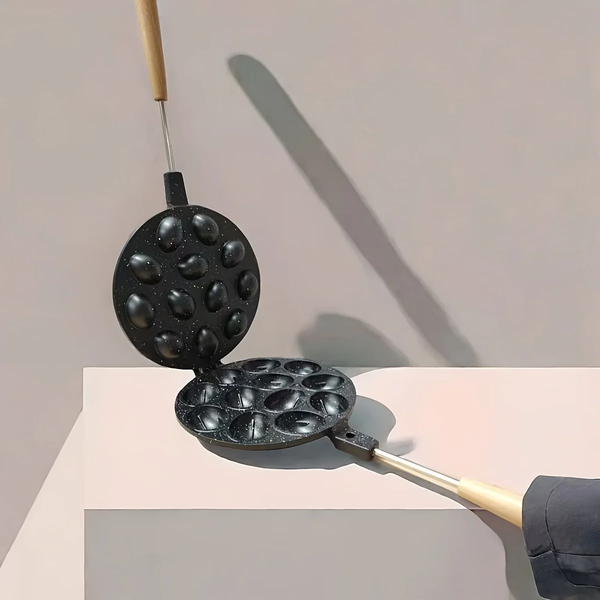 12-Cavity Round Pecan Mold Egg Waffle Pan for Gas Stove is a versatile baking mold designed for creating walnut-shaped cakes and egg pancakes. This mold allows you to make delicious treats with ease, perfect for family gatherings or special occasions.