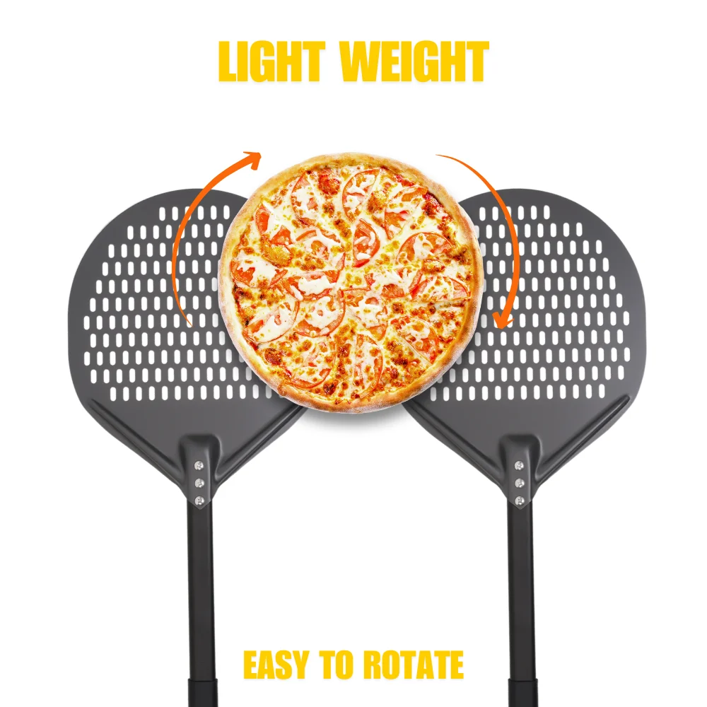 The 12 Inch Aluminum Perforated Pizza Shovel Peel is an essential tool for any pizza enthusiast. Designed for easy sliding, turning, and retrieving of pizzas, this baking paddle is perfect for use in ovens and grills.