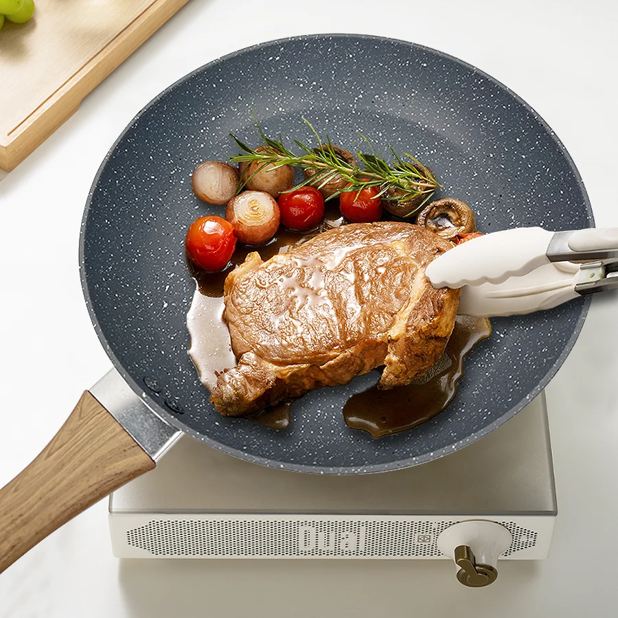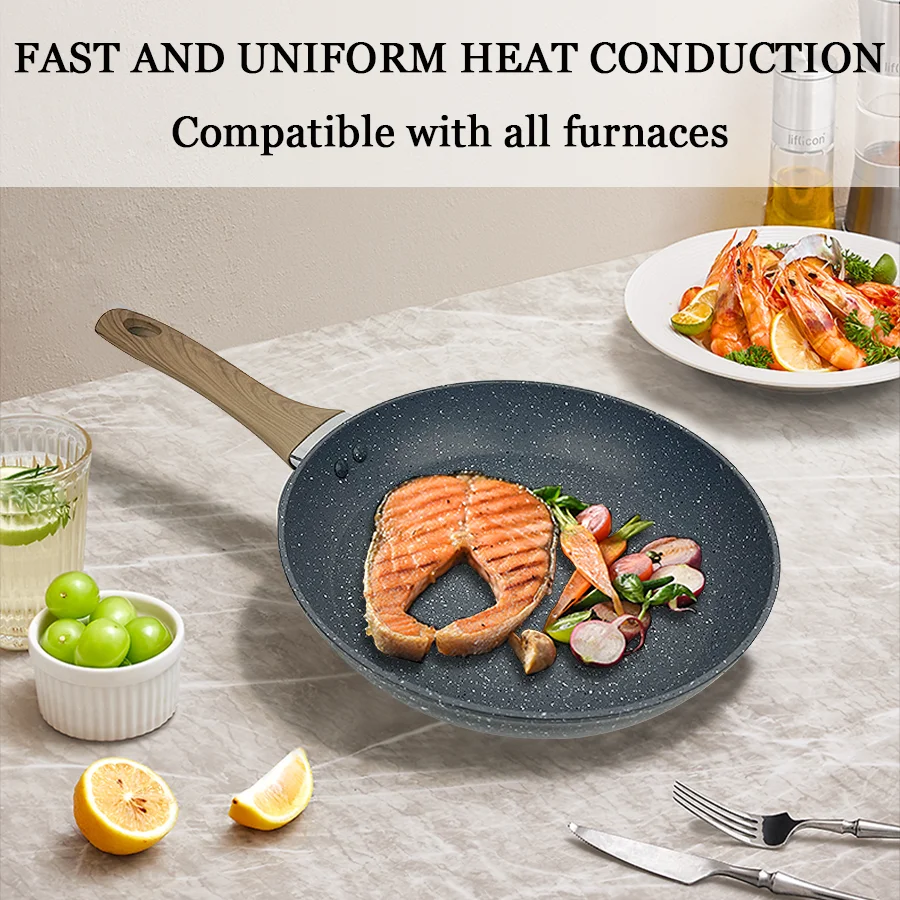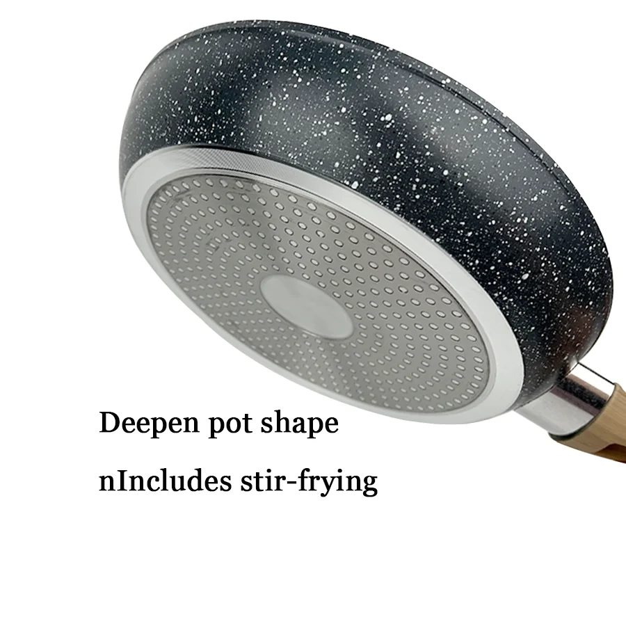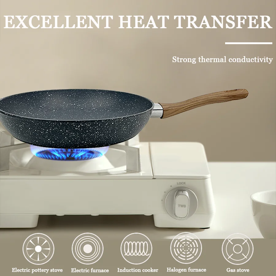This nonstick frying pan is available in three sizes: 18cm, 24cm, and 28cm. It features a wooden handle for a comfortable grip and is suitable for cooking steak, pancakes, and fried eggs. Ideal for use on both gas and induction stoves, this pan is a versatile addition to your kitchen cookware.