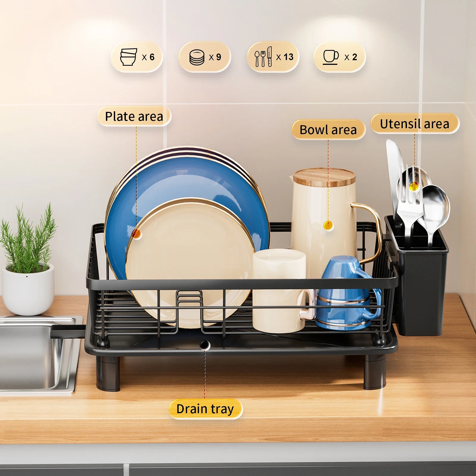 This dish drying rack is designed for kitchen countertop storage, featuring a drained board for efficient drying. Available in black and white colors, it offers a stylish and functional solution for drying dishes.