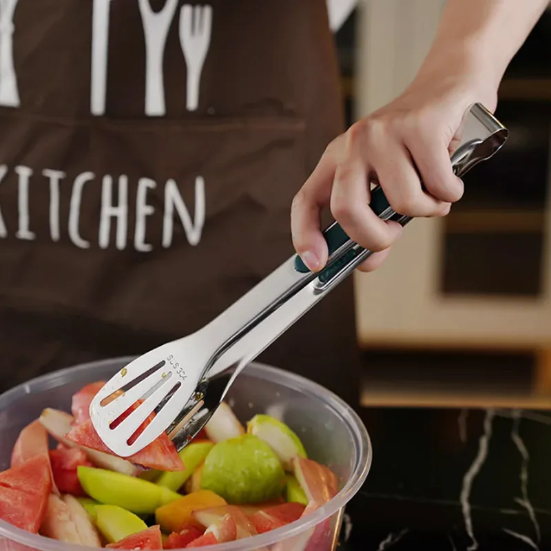 These stainless steel non-slip food tongs are perfect for handling meat, salad, bread, and barbecue grilling. Available in three sizes: approximately 7 inches, 9 inches, and 12 inches, they are designed for durability and ease of use.