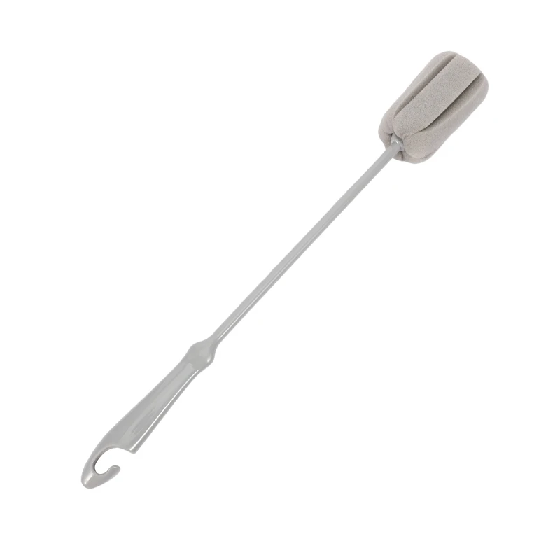 This sponge brush is designed for effectively cleaning milk bottles, cups, and glasses in the kitchen. Made from eco-friendly plastic, it features a long handle for easy use.
