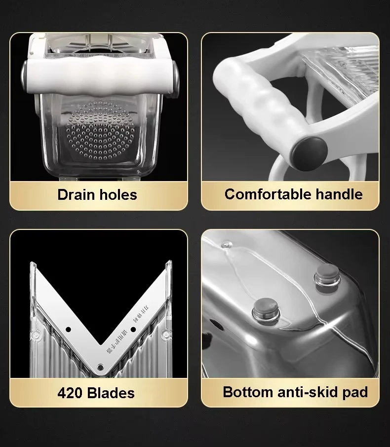This multifunctional vegetable slicer is designed for efficient slicing and shredding of fruits and vegetables. It features an ultra-sharp V blade that ensures precise cuts, making it an essential kitchen gadget for both home cooks and professional chefs.