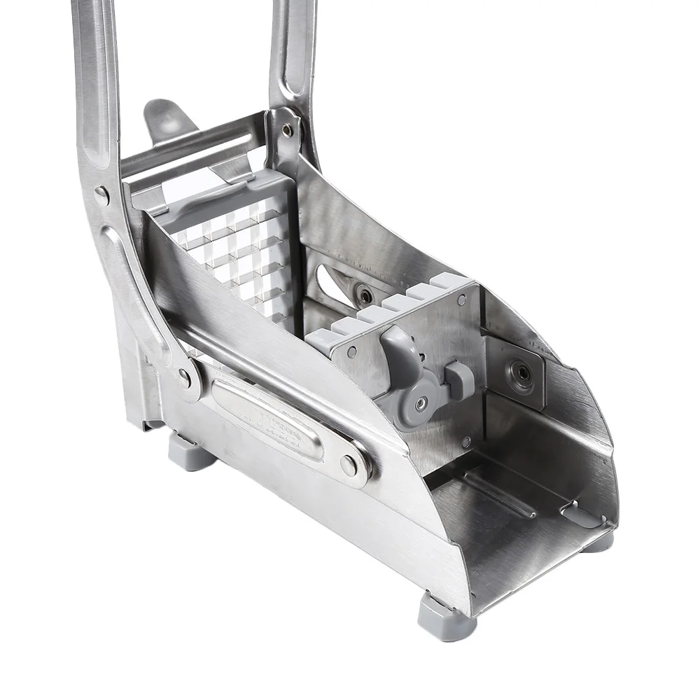 This stainless steel potato cutter is a versatile kitchen tool designed for making French fries, potato chips, and more. It is easy to clean with removable parts and is perfect for home or restaurant use.