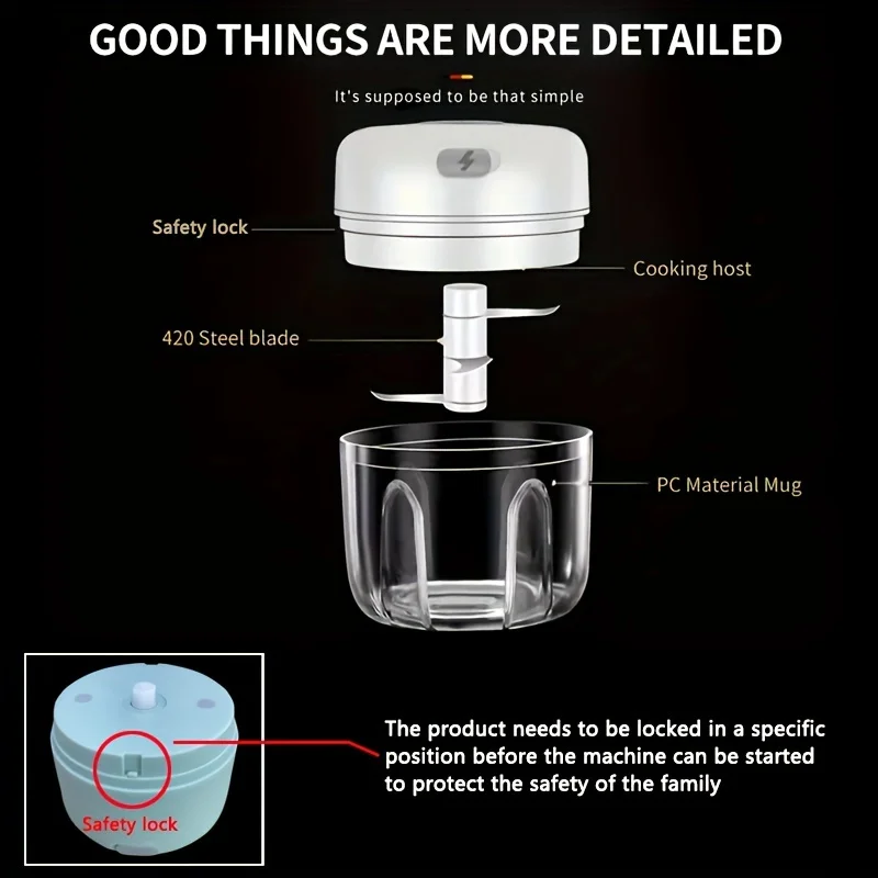 This 250ml Mini Rechargeable Garlic Chopper Meat Grinder is a durable and sturdy kitchen appliance designed for efficiently crushing garlic, chili, onions, minced meat, nuts, and more.