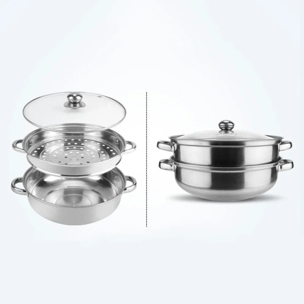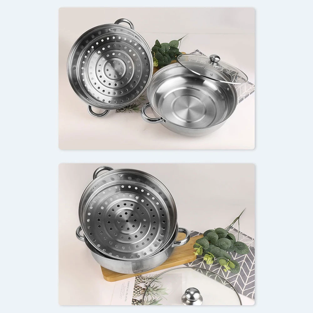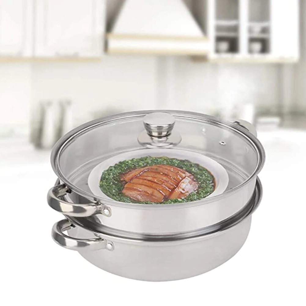 This 28cm 2-layer steamer is perfect for boiling soup and steaming vegetables at home. Made from high-quality stainless steel, it features a smooth surface for safe handling and a transparent glass lid for easy food monitoring.
