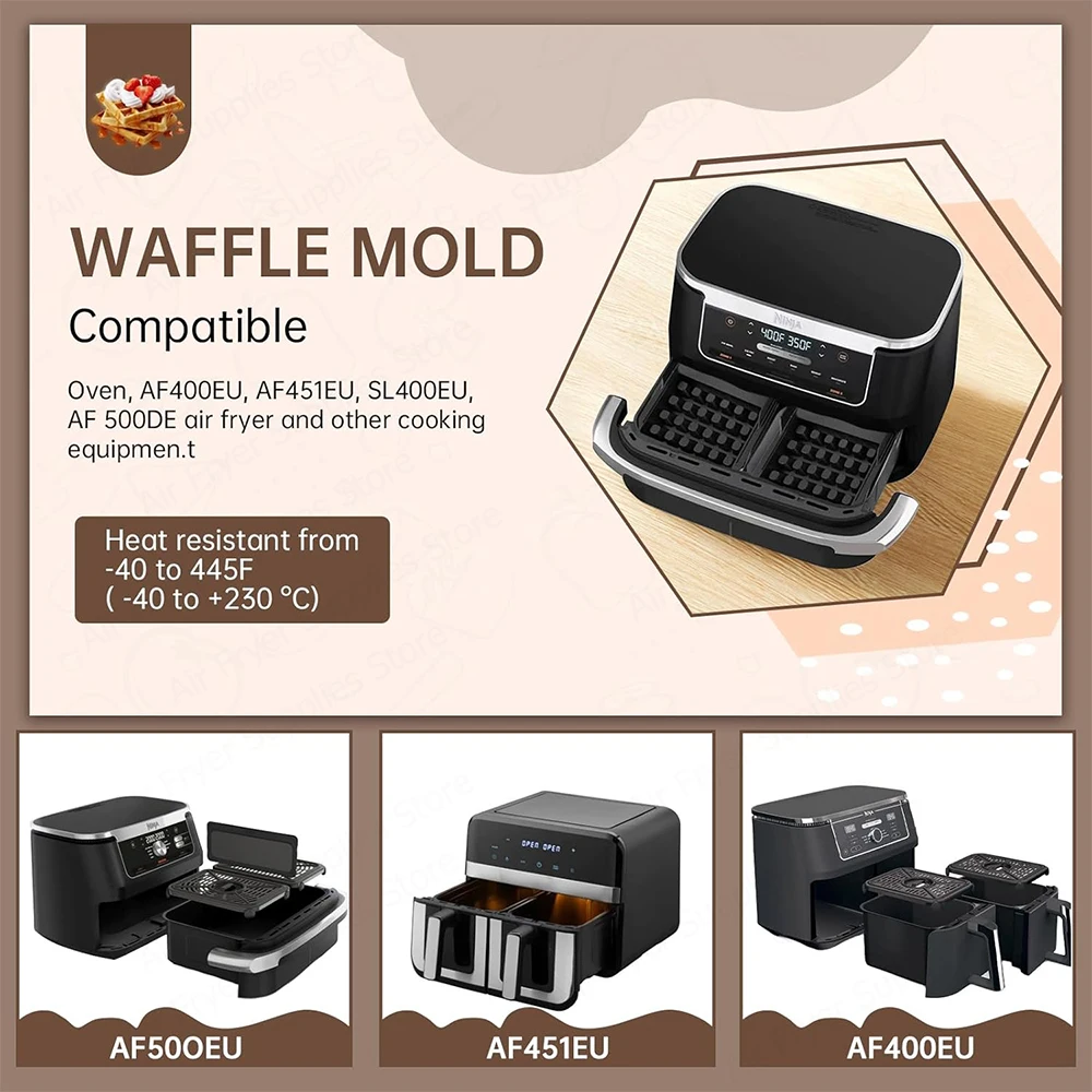 Transform your air fryer into a waffle maker with our silicone waffle molds, designed specifically for Ninja Deep Fryers and compatible with various models including AF300EU, AF400EU, AF451EU, SL400EU, and AF500DE.