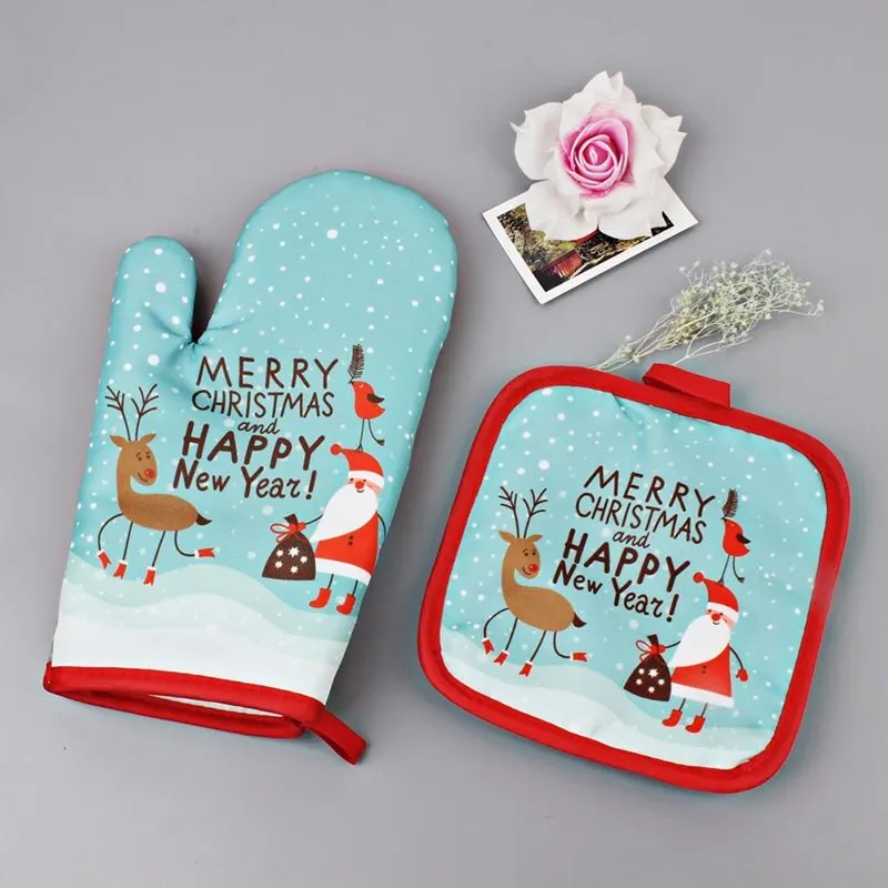 2pcs Set Christmas Oven Mitts Pot Holders Baking Anti Hot Gloves Kitchen Cooking BBQ