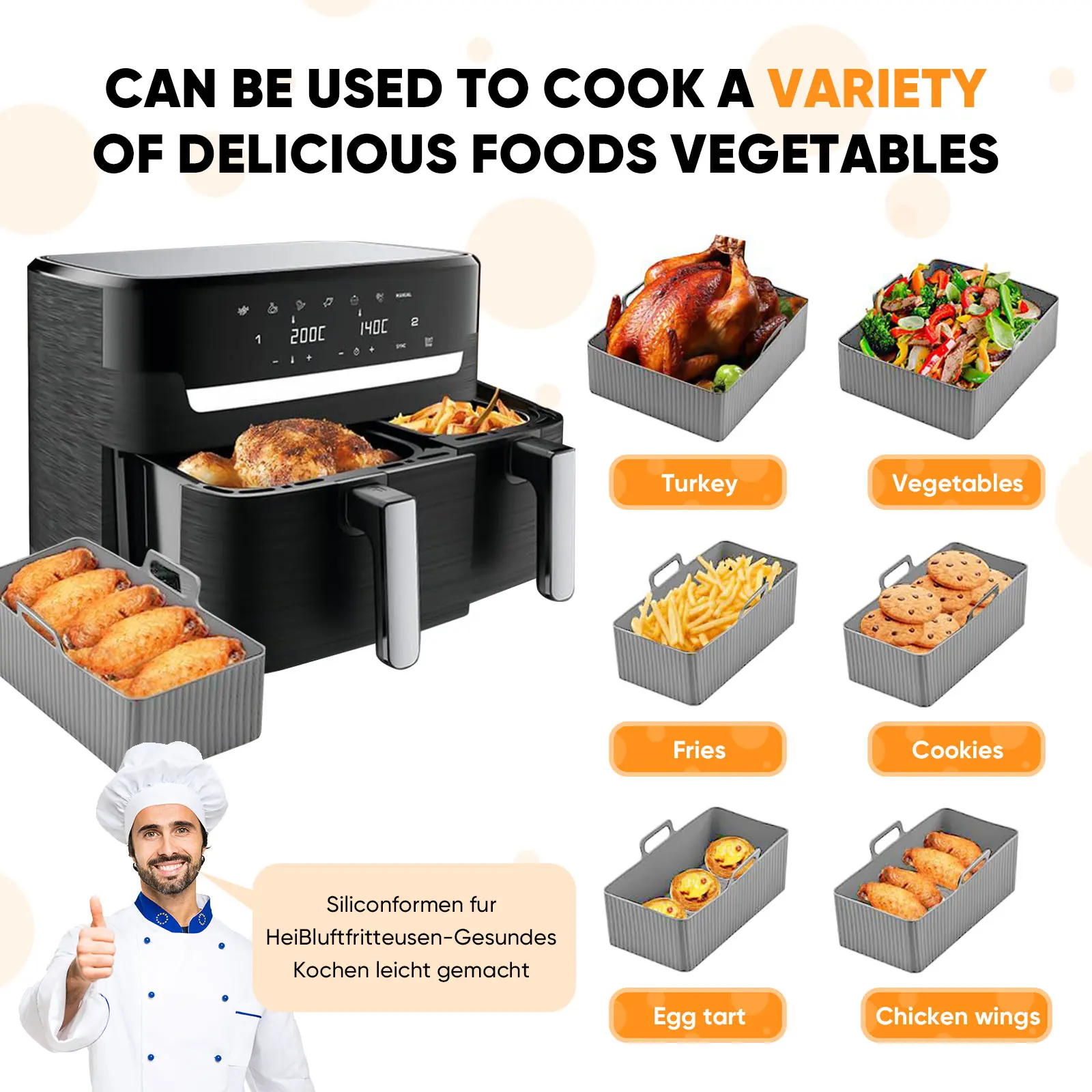2pcs Set Silicone Air Fryer Mat is a versatile kitchen tool designed for use in air fryers and ovens. These reusable baking trays provide a non-stick surface for easy cooking and cleaning, making them an essential addition to your kitchen accessories.