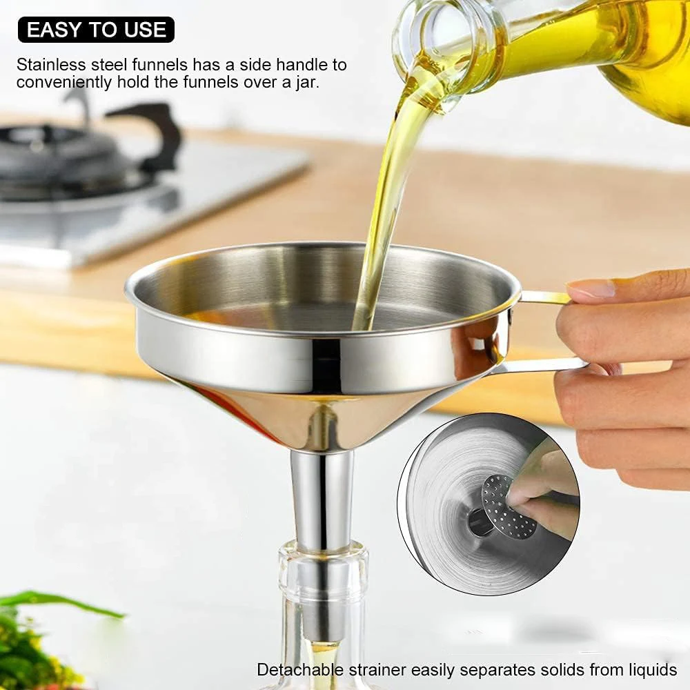 Stainless Steel Kitchen Funnel Food Grade Metal Funnel with Strainers 3 Sizes