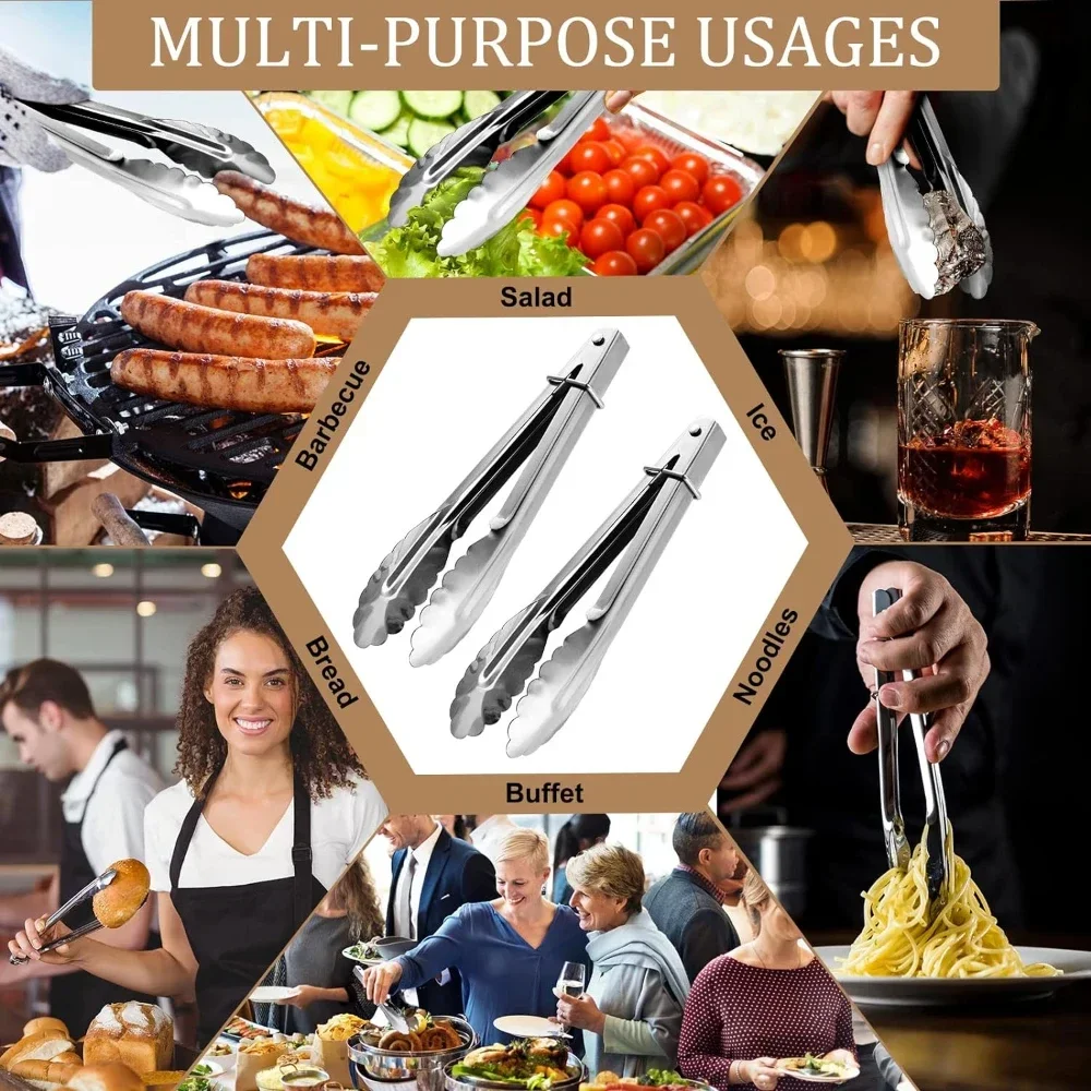 These stainless steel non-slip food tongs are perfect for a variety of kitchen tasks, including serving salads and bread. They come in a set of five different sizes, making them versatile tools for cooking and serving.