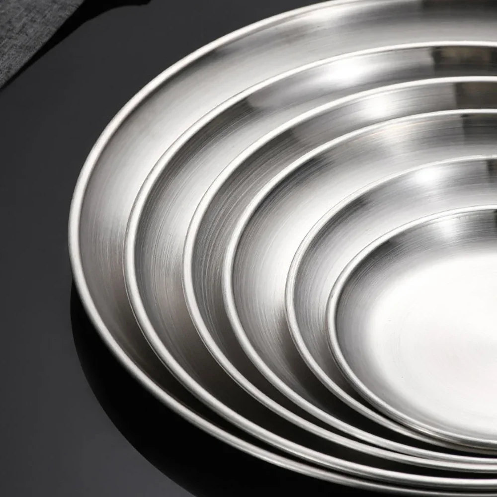 This 6-piece stainless steel plate set is perfect for serving a variety of dishes, including BBQ, fried chicken, vegetables, fruits, and desserts. Ideal for use in hotels, restaurants, family homes, and parties, these plates combine functionality with a sleek design.