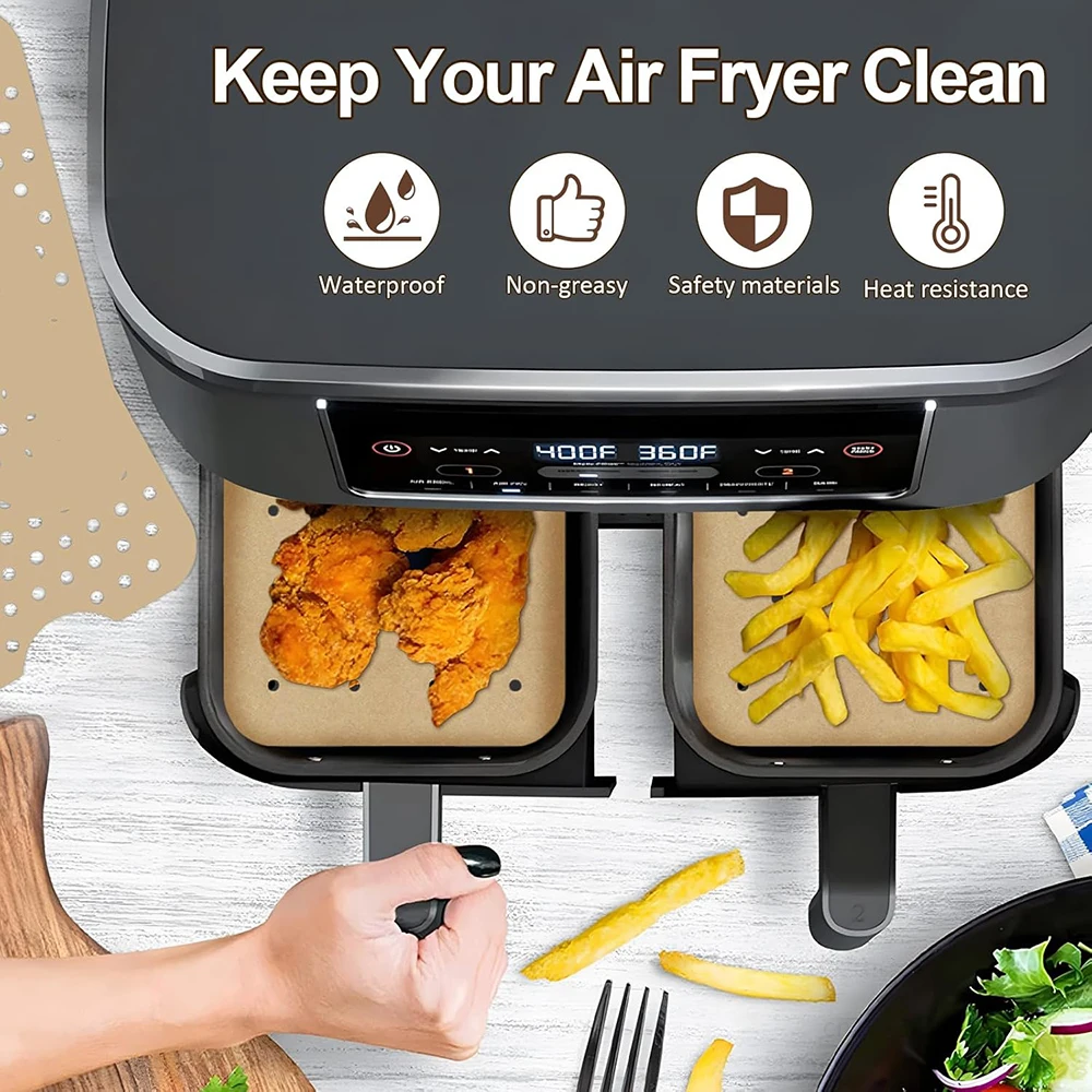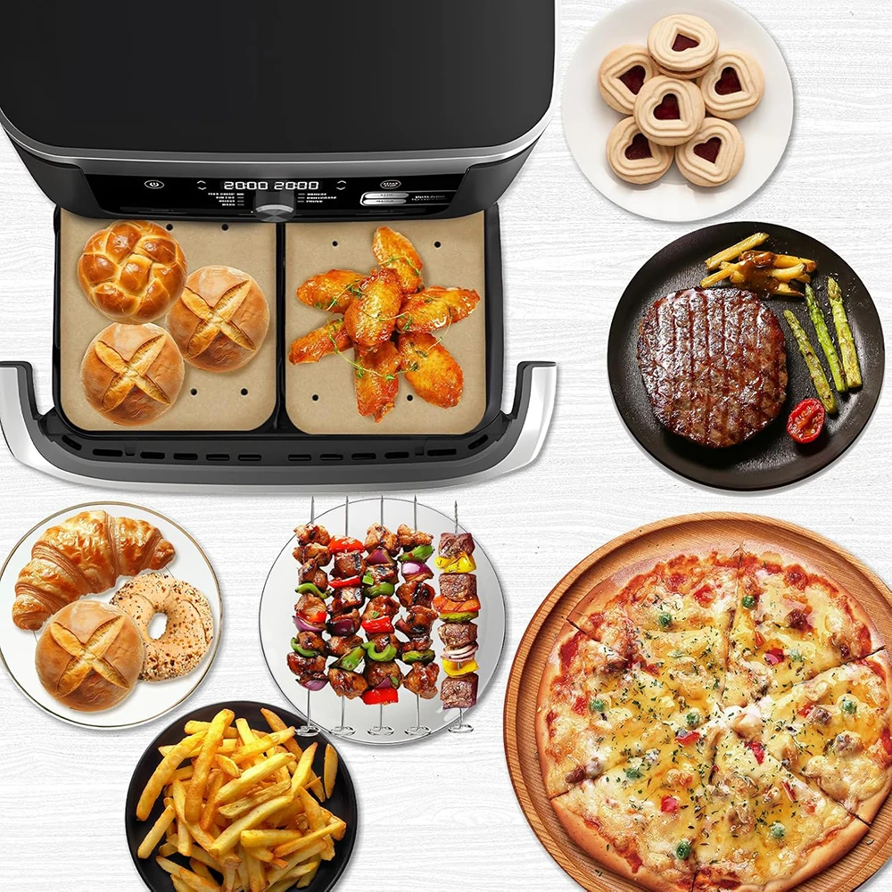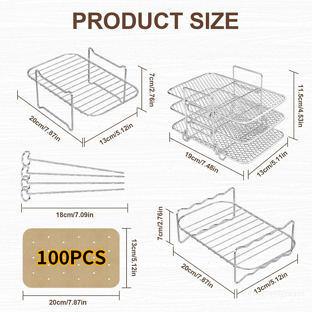 - Comprehensive Kit: The set includes two stainless steel racks, a skewer rack with four skewers, and 100 pieces of natural wood pulp parchment paper liners, providing everything needed for versatile air frying.