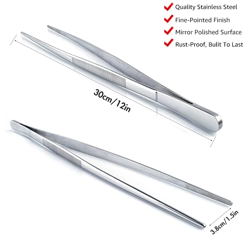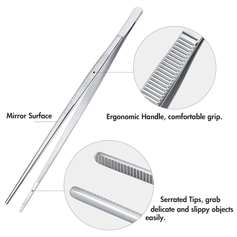 Introducing the Stainless Steel 12-Inch Kitchen Tongs, perfect for BBQ, food styling, and baking. These colorful culinary precision tweezers are designed to enhance your cooking experience with their durable stainless steel construction and vibrant colors.