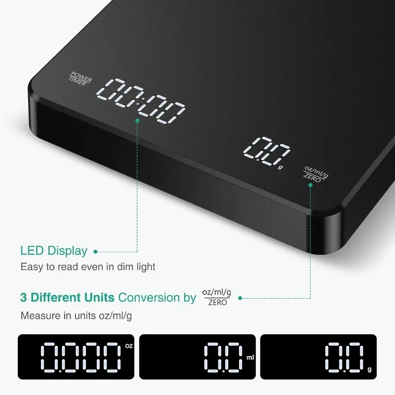 Digital Rechargeable Coffee Scale with Timer 3kg Max 0.1g Precision LED Screen
