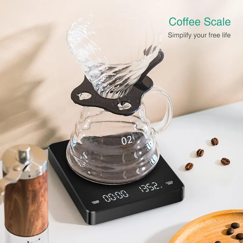 The Digital Rechargeable Coffee Scale is designed for precision coffee brewing, featuring a maximum capacity of 3kg and a precision of 0.1g. It includes a built-in timer and an easy-to-read LED screen, making it an essential tool for coffee enthusiasts.