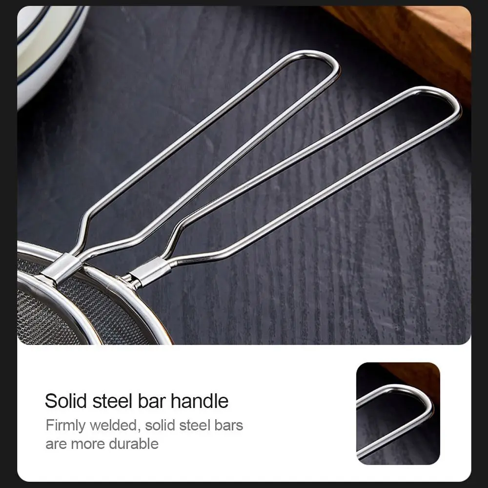 This stainless steel mesh strainer is designed for various kitchen tasks, making it ideal for straining flour, soybean milk, snacks, and French fries. With a range of sizes, it is a versatile tool for any cooking enthusiast.