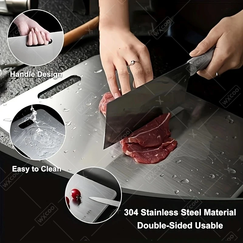 The Double Sided 304 Stainless Steel Cutting Board is designed for versatility and durability, making it an essential tool for any kitchen. Its smooth surface allows for easy cleaning, and the board is suitable for cutting a variety of foods including meat, fruits, and vegetables.