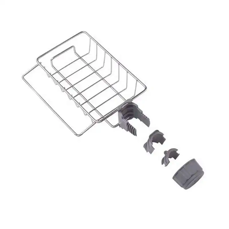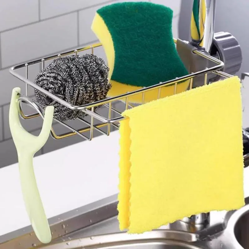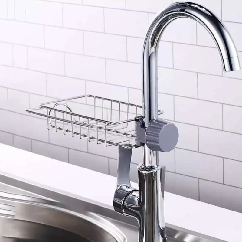 This kitchen faucet sponge holder is designed to provide convenient storage for your kitchen essentials. It features a sleek stainless steel bracket that can hold sponges, towels, and soap, keeping your sink area organized and tidy.