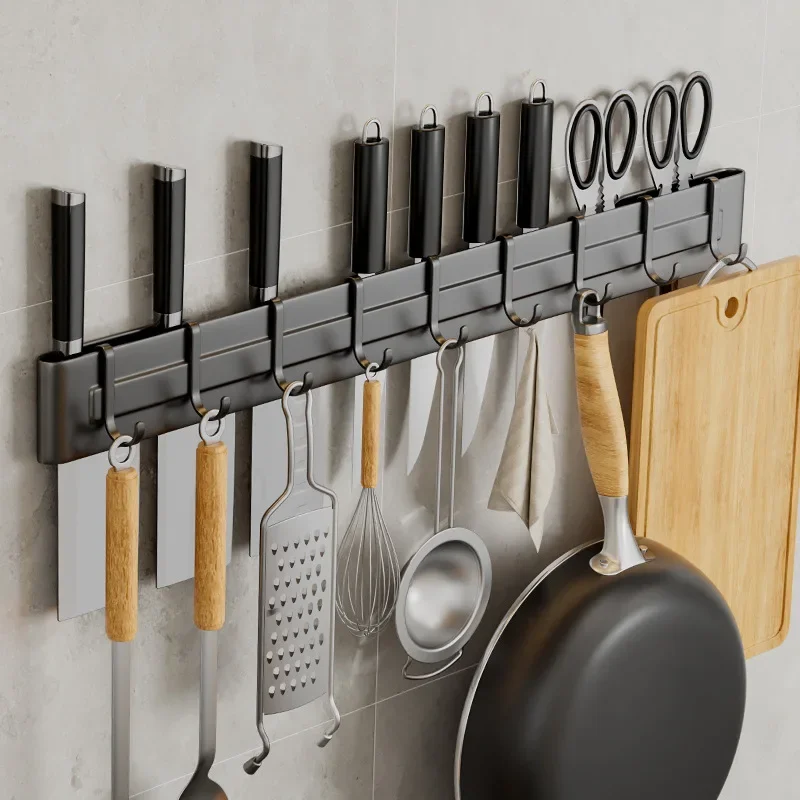 Organize your kitchen with this wall-mounted knife holder that requires no drilling for installation. It is designed to save space while keeping your knives easily accessible.