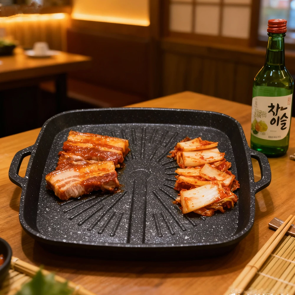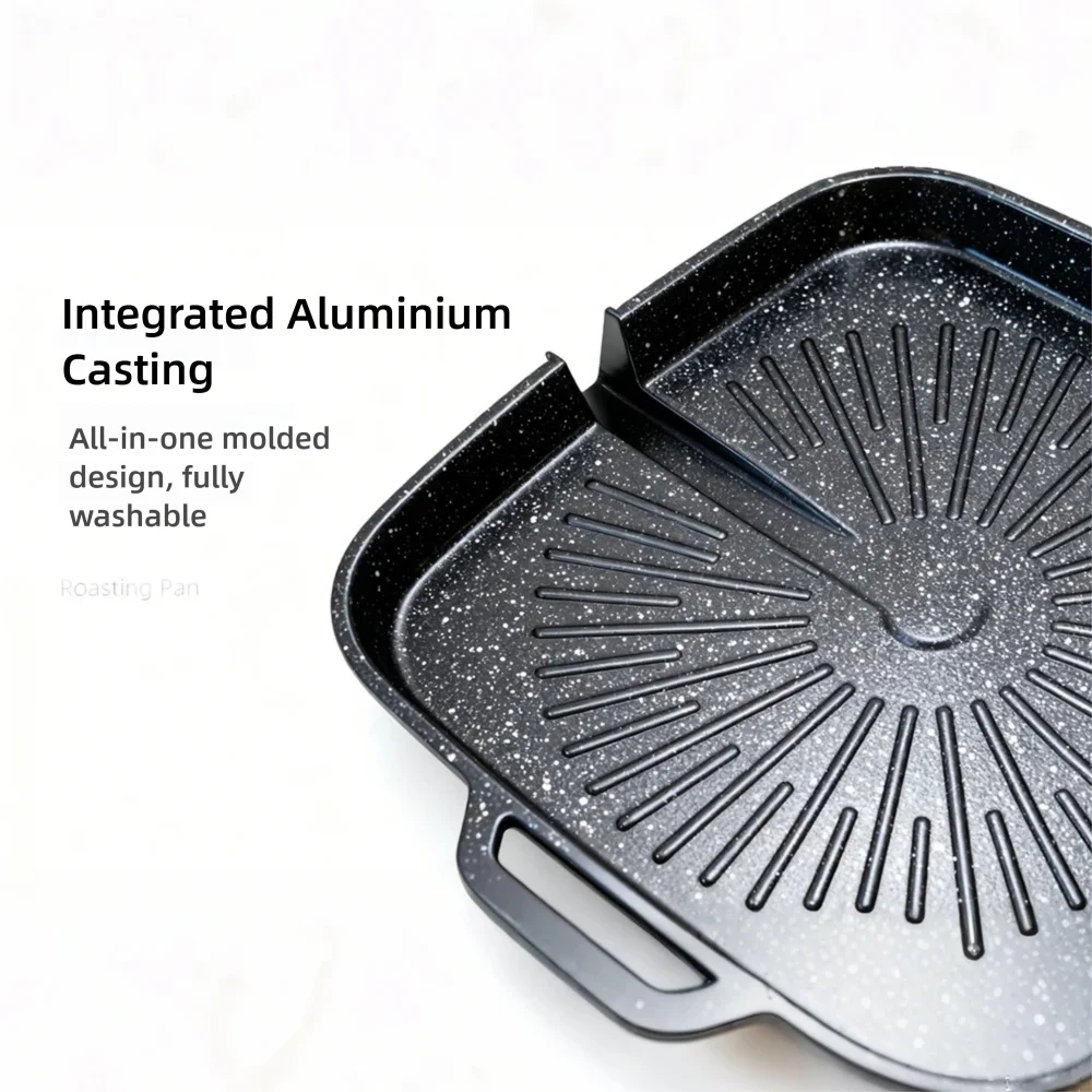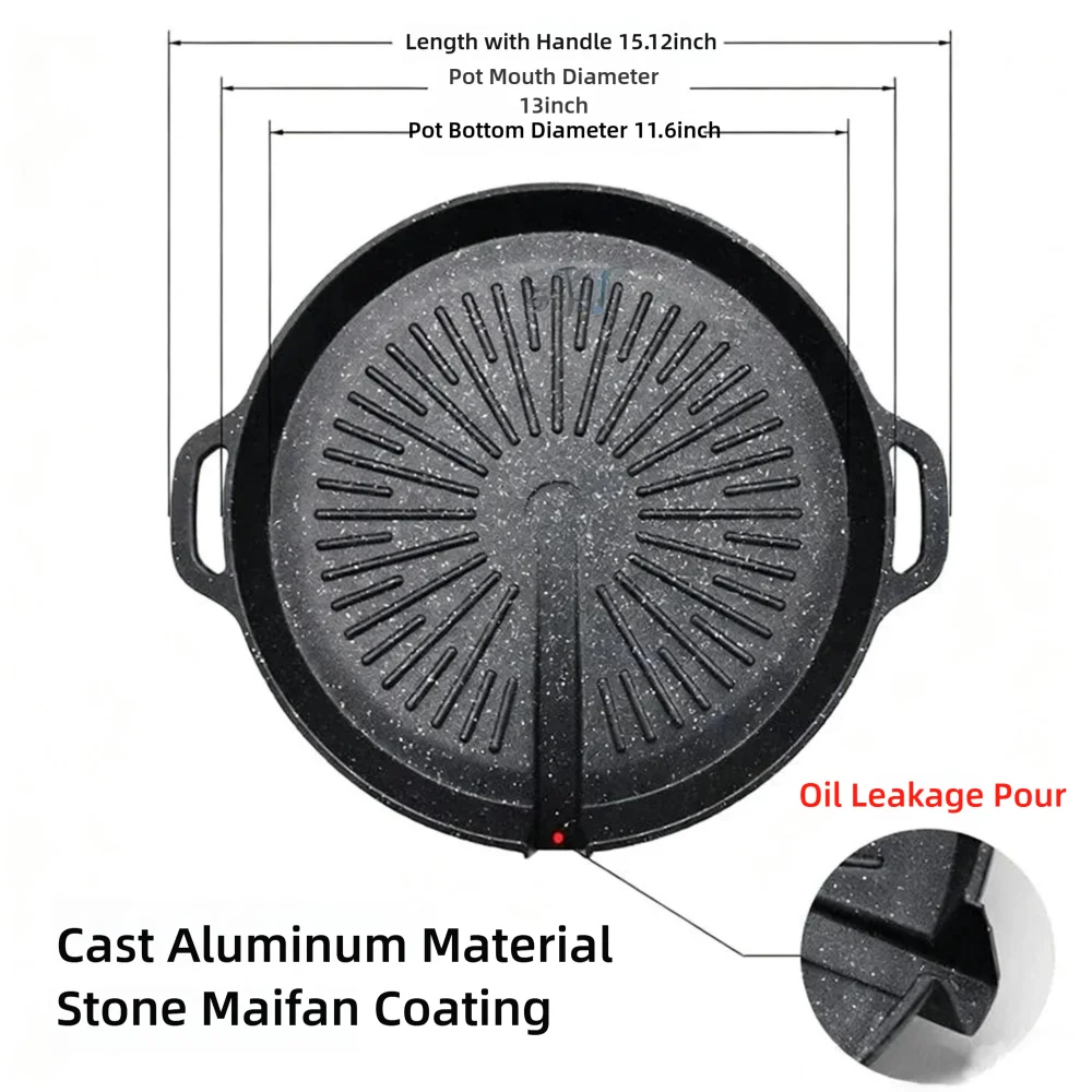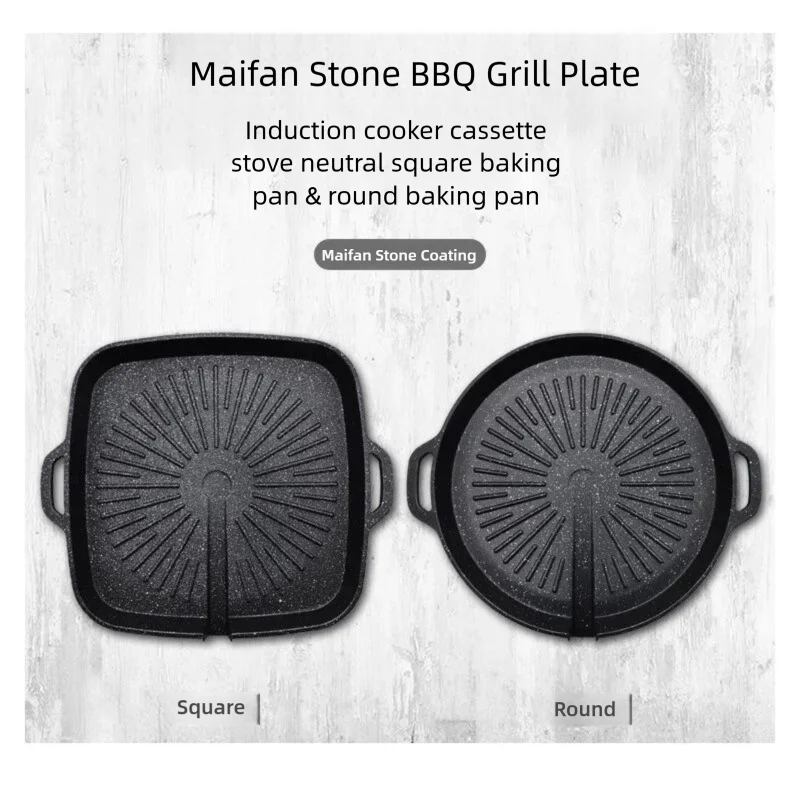 Korean Grill Pan Nonstick Skillet Smokeless Barbecue Plate is perfect for household BBQ and baking. It is compatible with both gas and induction stoves and is dishwasher safe for easy cleaning.