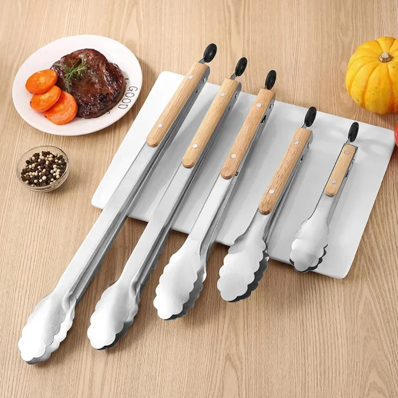 Leeseph Stainless Steel Food Tongs are heavy-duty kitchen tools designed for versatility and ease of use. With a wooden handle for a comfortable grip, these tongs are perfect for various cooking occasions, including home kitchens, restaurants, and BBQ grills.
