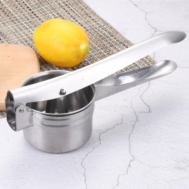 This multifunctional masher ricer press is designed for making smooth mashed potatoes and extracting juice from fruits and vegetables. Made from high-quality stainless steel, it is a durable kitchen tool that simplifies food preparation.