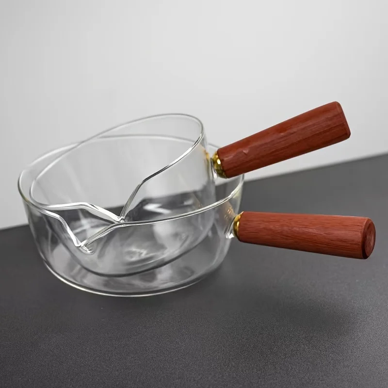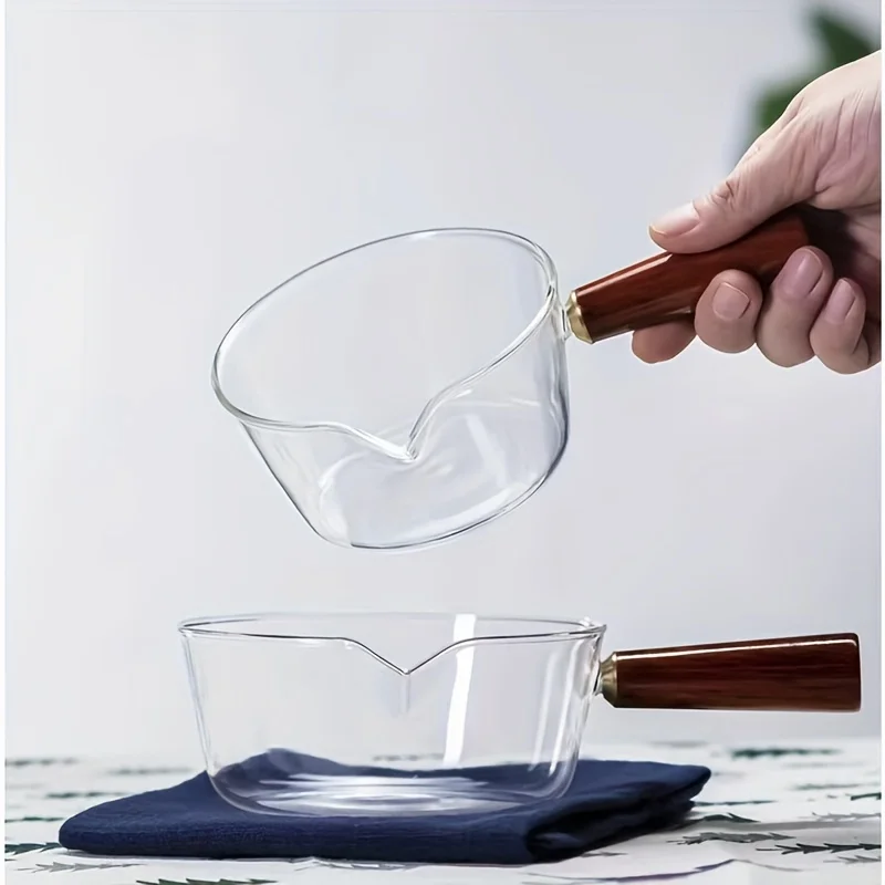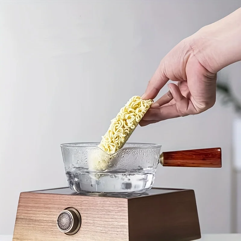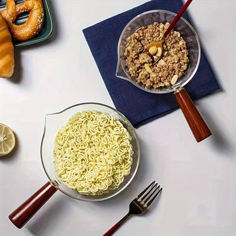 This multi-functional glass cooking pot is perfect for preparing milk, instant noodles, and soups. It features a wooden handle and is designed for open flame heating, making it a versatile addition to your kitchen cookware collection.