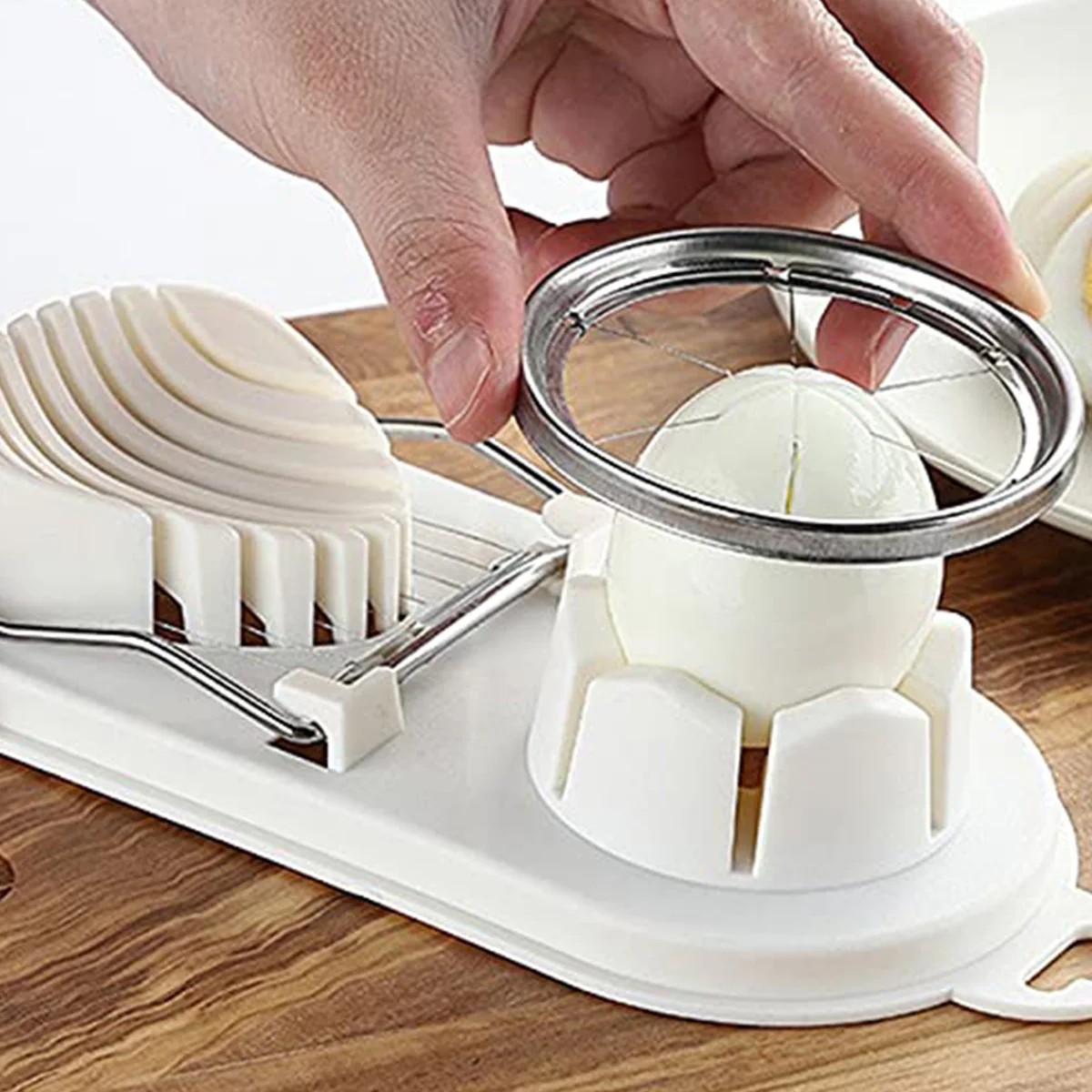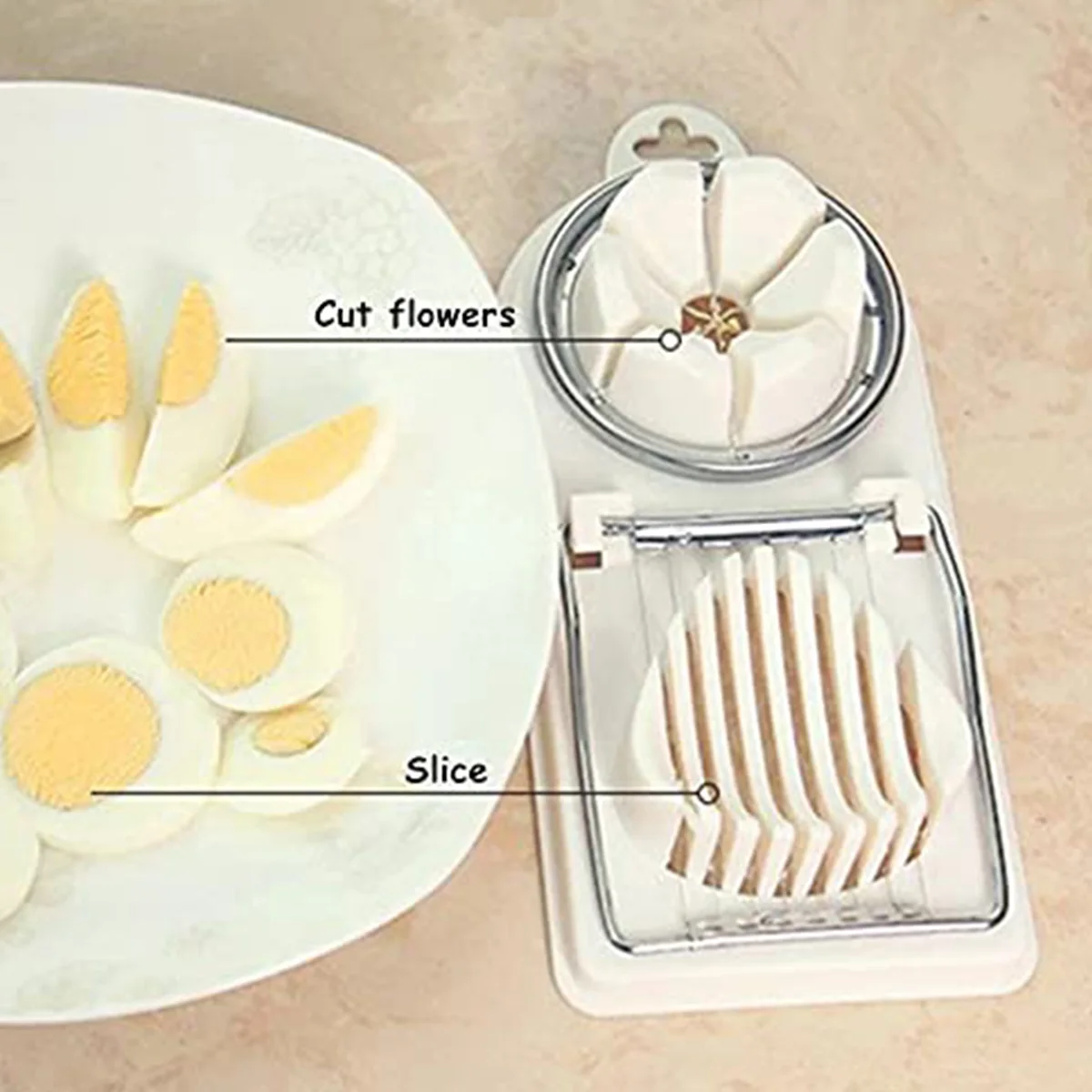 - 2-in-1 functionality for slicing and cutting eggs.