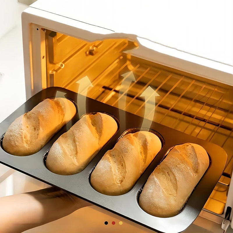 This Nonstick Perforated 4 Cup French Bread Mold is designed for baking baguettes, hot dog buns, and toast cakes. Made from durable carbon steel, it ensures even heating and easy release of baked goods.