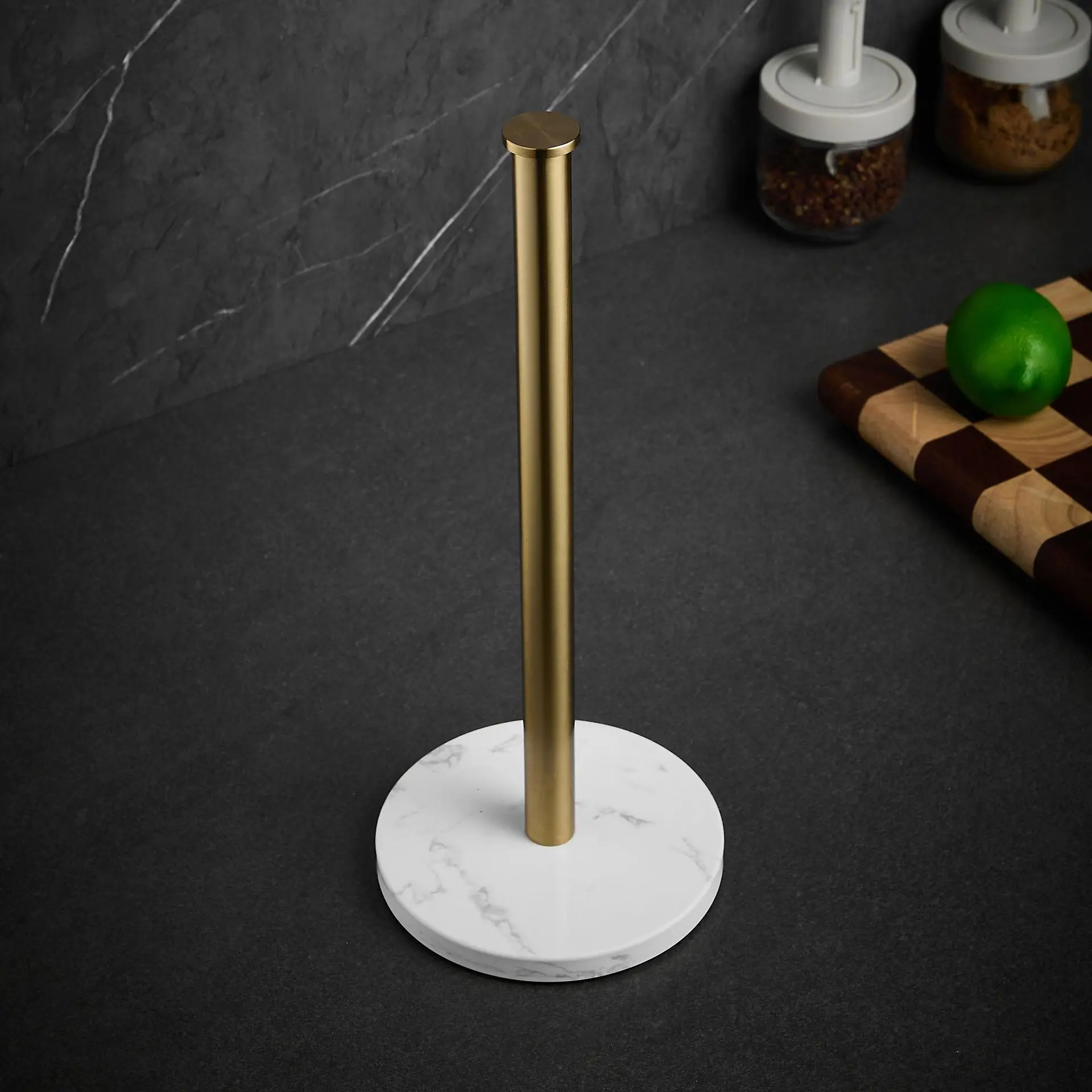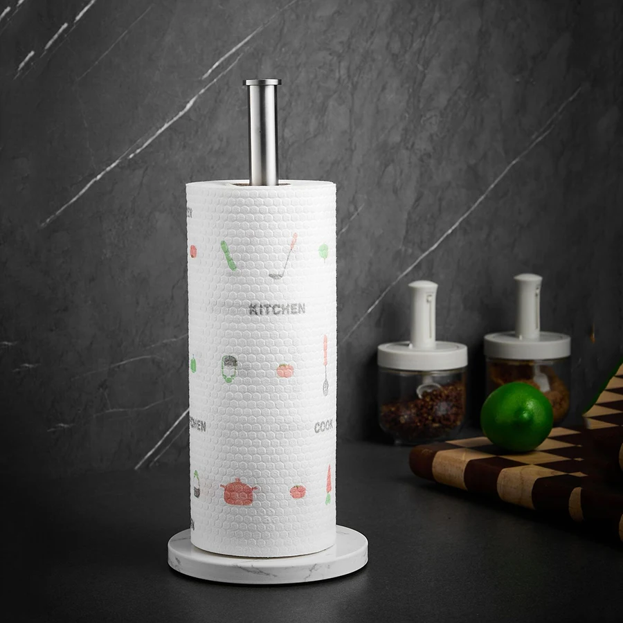 Introducing the Nordic Marble Paper Towel Holder, a stylish and functional addition to your kitchen. This vertical napkin holder is designed to keep your paper rolls organized and easily accessible, enhancing your kitchen decor with its elegant marble finish.
