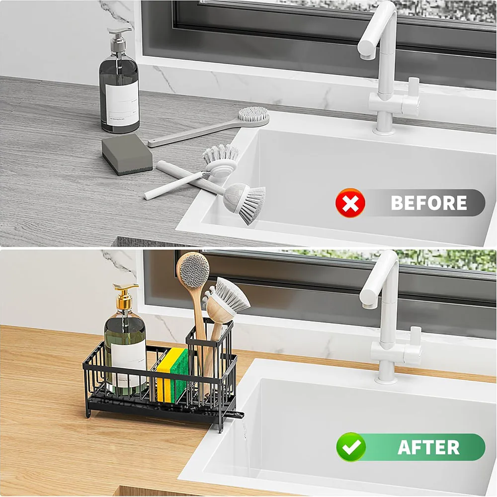 This kitchen sink caddy is designed to keep your sink area organized and tidy. It features a high brush holder and ample space for sponges and other cleaning tools, making it an essential accessory for any kitchen.