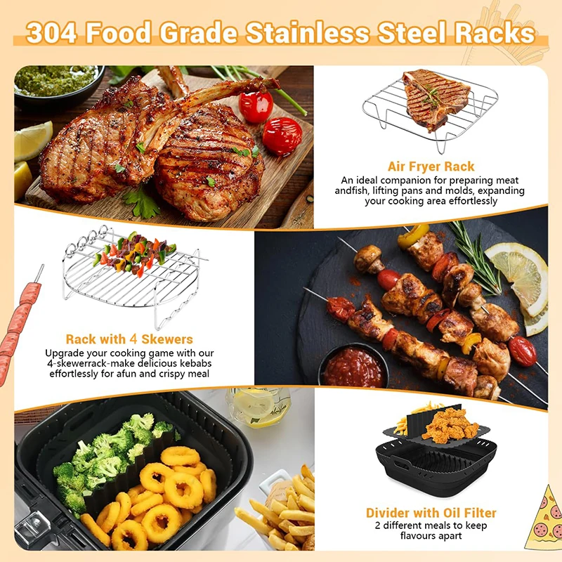 This versatile square hot air fryer accessory is designed to enhance your cooking experience. It is compatible with various air fryer models, allowing you to grill, bake, and dehydrate your favorite foods with ease.