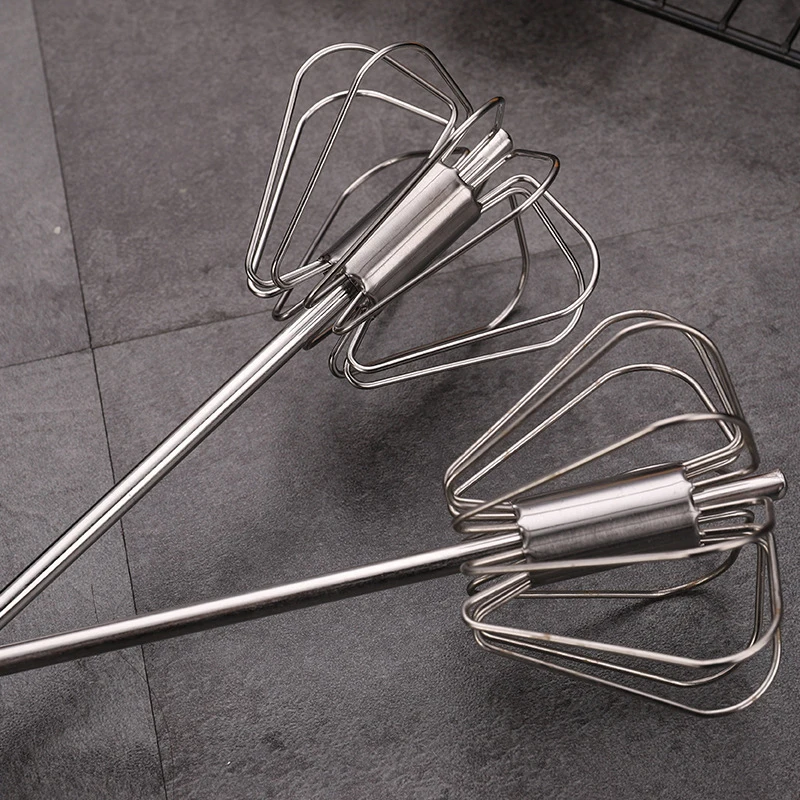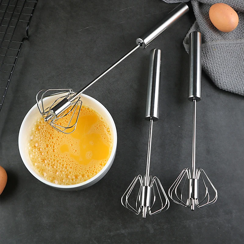 This stainless steel semi-automatic egg beater is designed for efficient egg stirring and mixing. It is a hand-held kitchen gadget that makes baking and cooking easier.