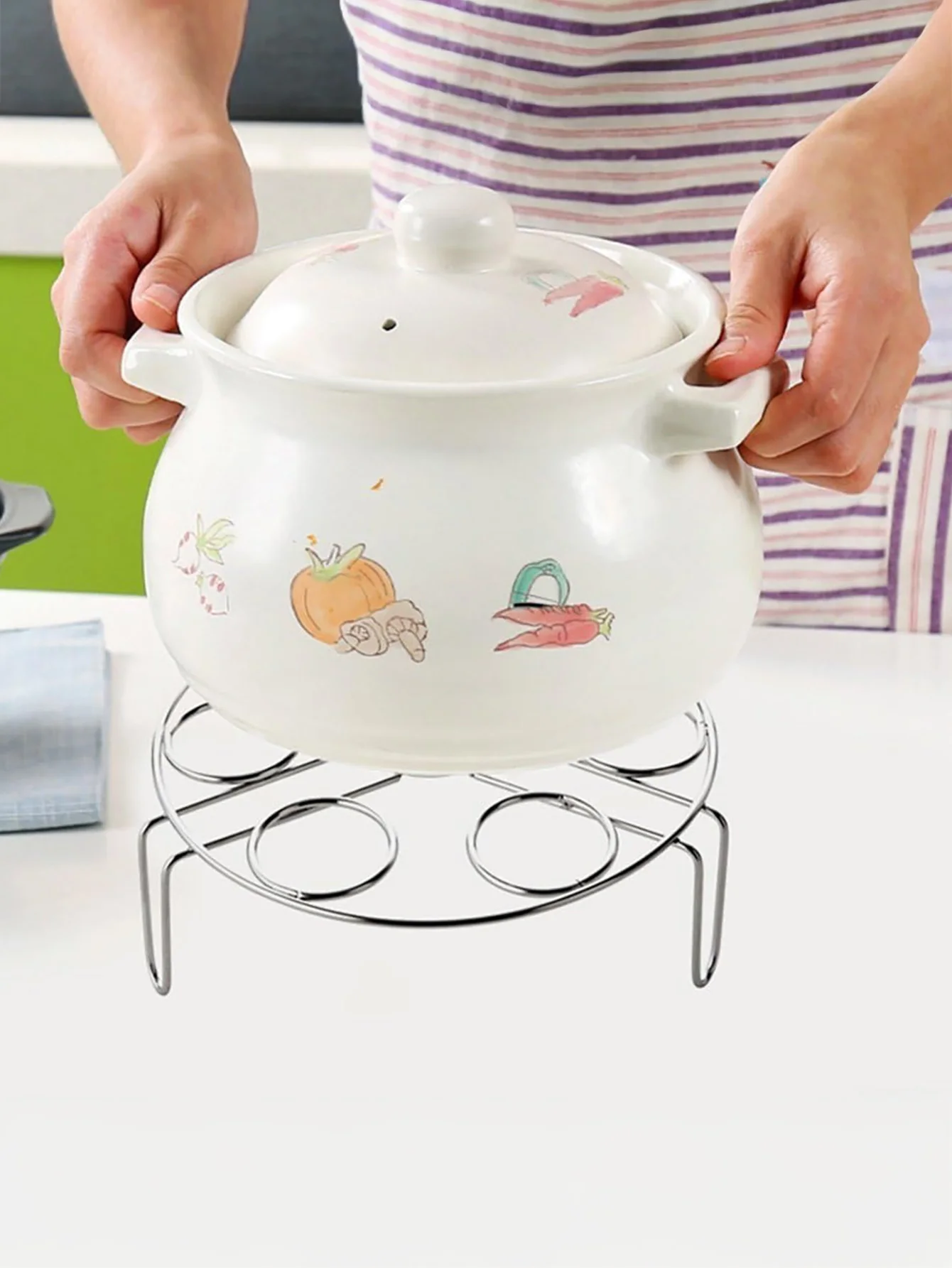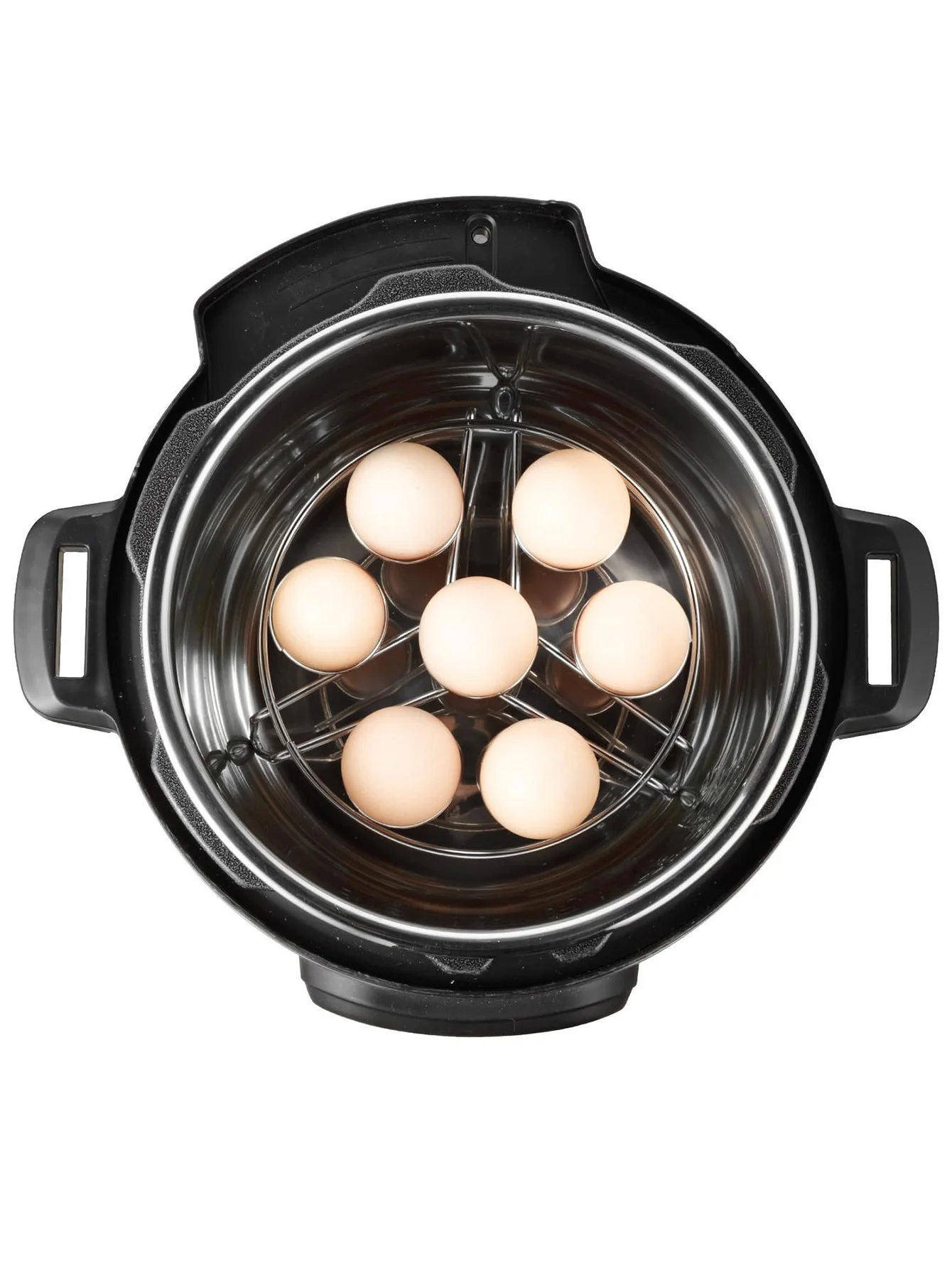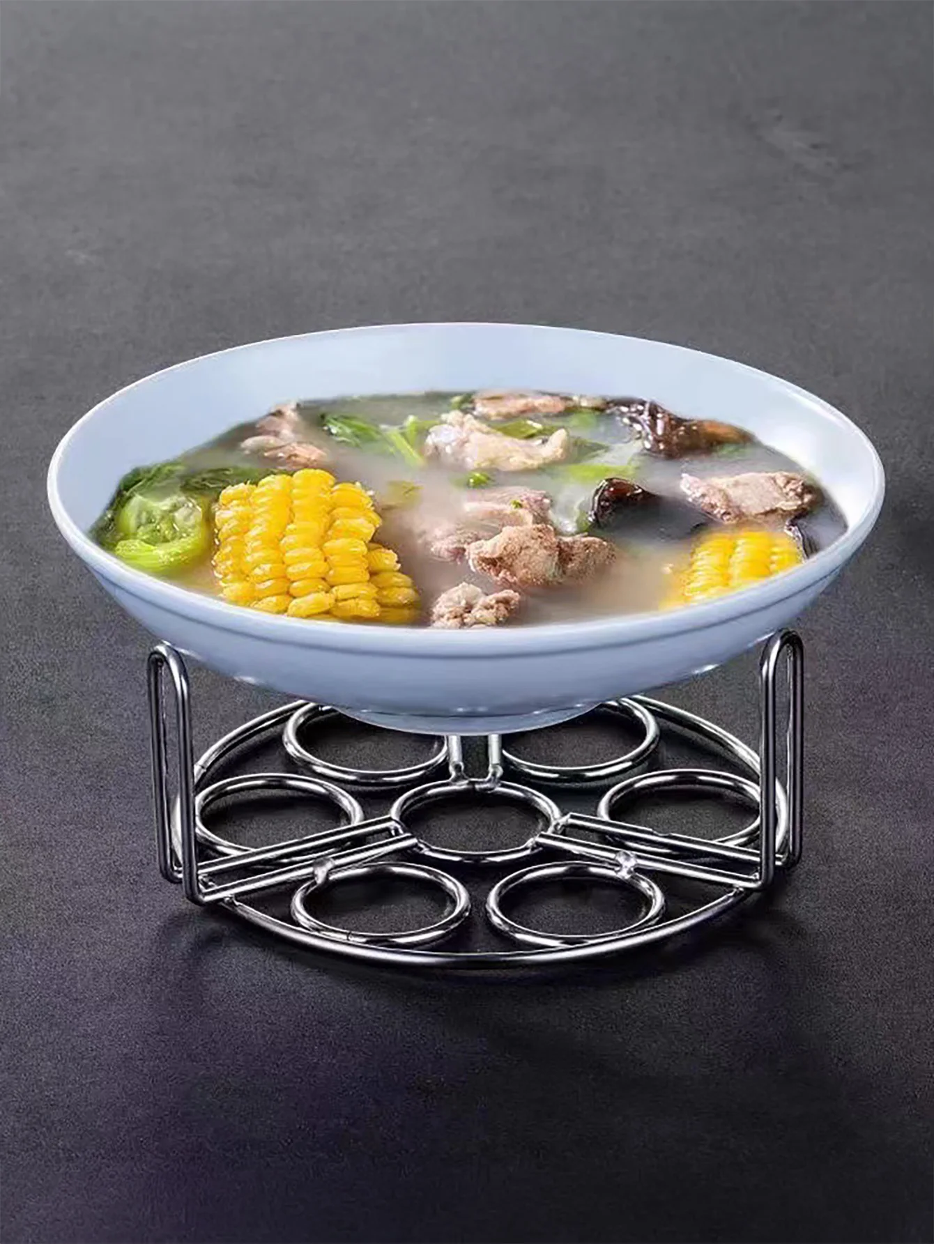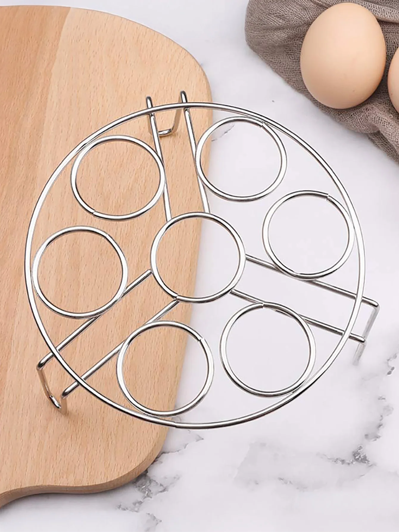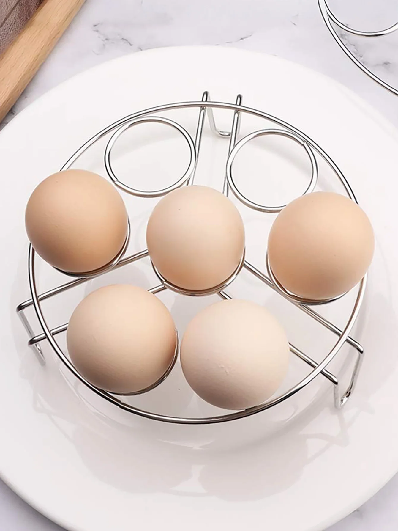 This stainless steel egg steamer rack is designed for efficient steaming of eggs and other foods. Its sturdy construction ensures durability and stability while cooking.