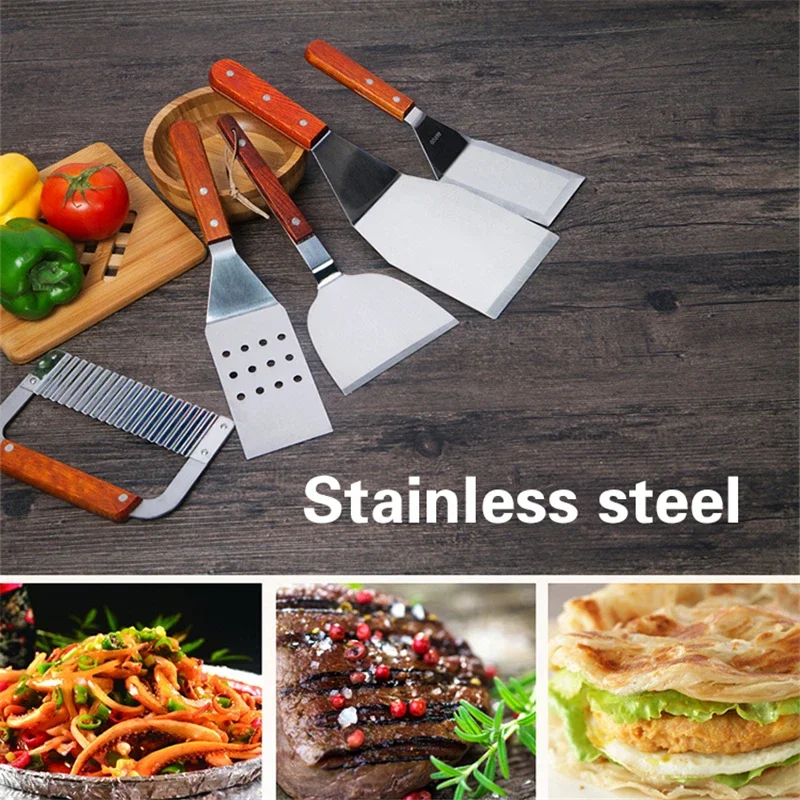 This stainless steel spatula is designed for versatile kitchen use, perfect for flipping, lifting, and serving a variety of foods including steak and pizza. The wooden handle provides a comfortable grip, making it easy to maneuver while cooking.