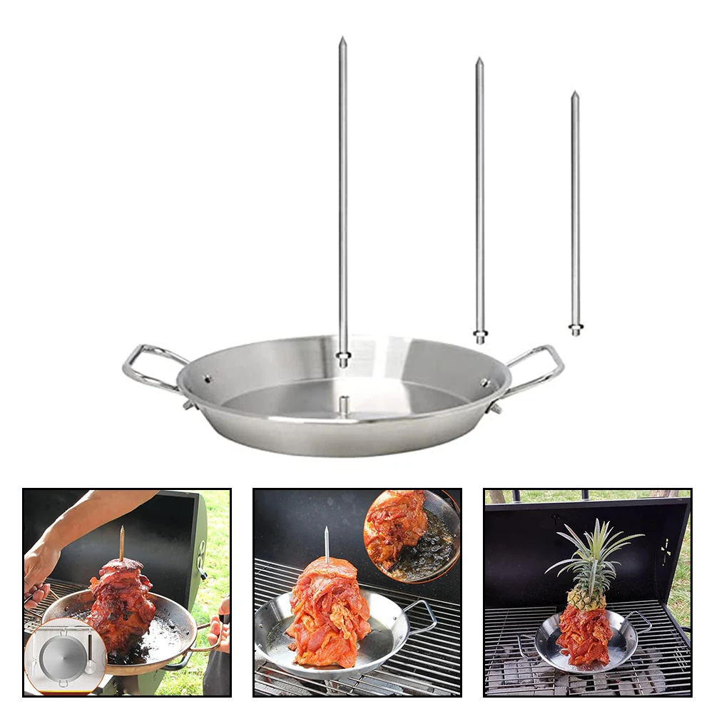 This stainless steel vertical skewer is designed for grilling and is perfect for making delicious al pastor tacos. Its sturdy construction ensures durability and stability while cooking various meats.