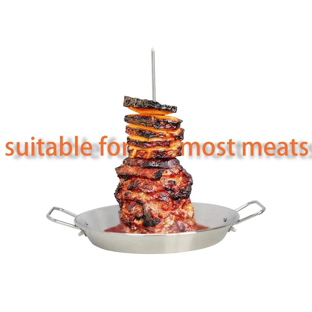 This versatile vertical cooking stand is perfect for making tacos al pastor, gyros, shawarma, chicken, kabobs, and more. It features a bowl-like design that captures juices during cooking, preventing messes in your oven or grill.