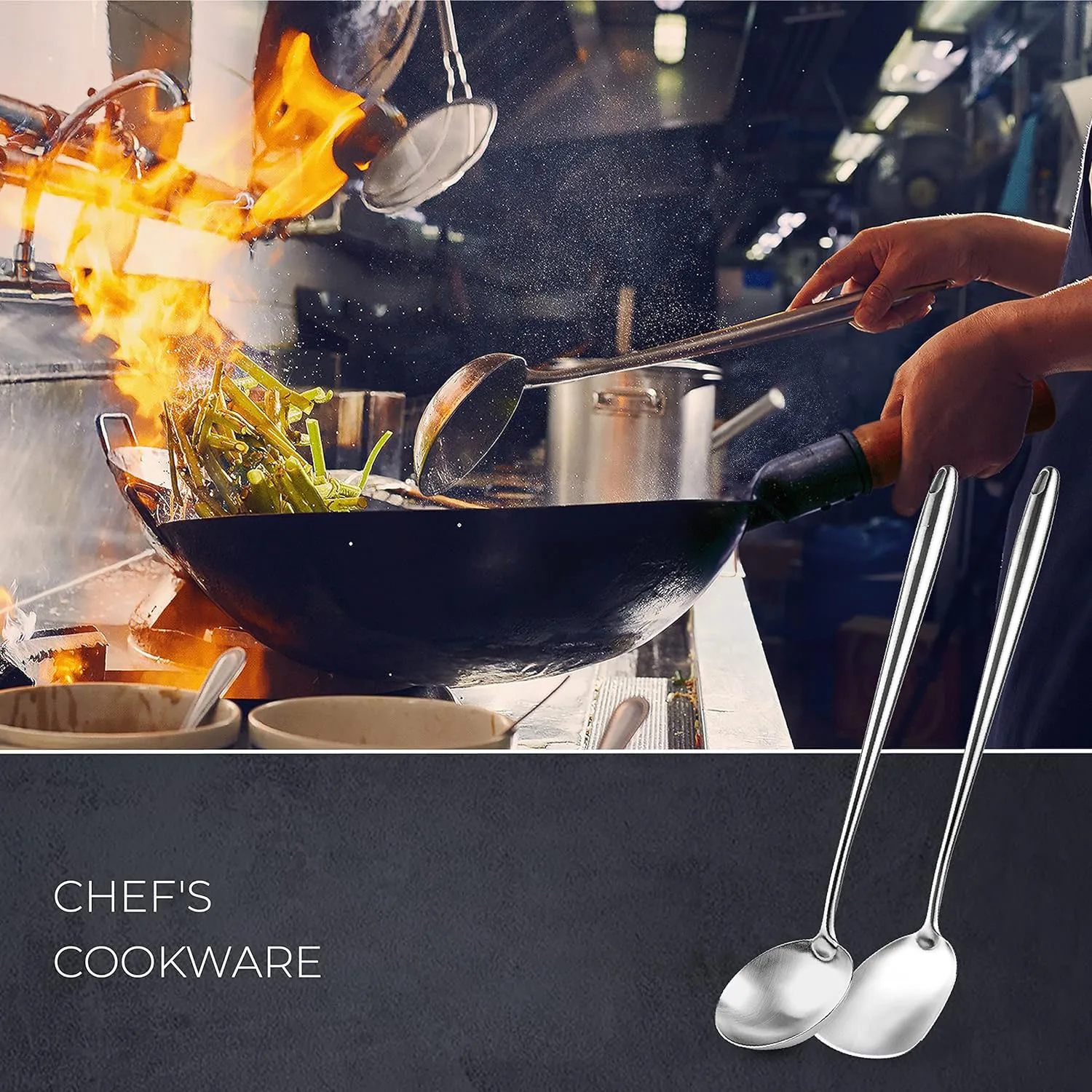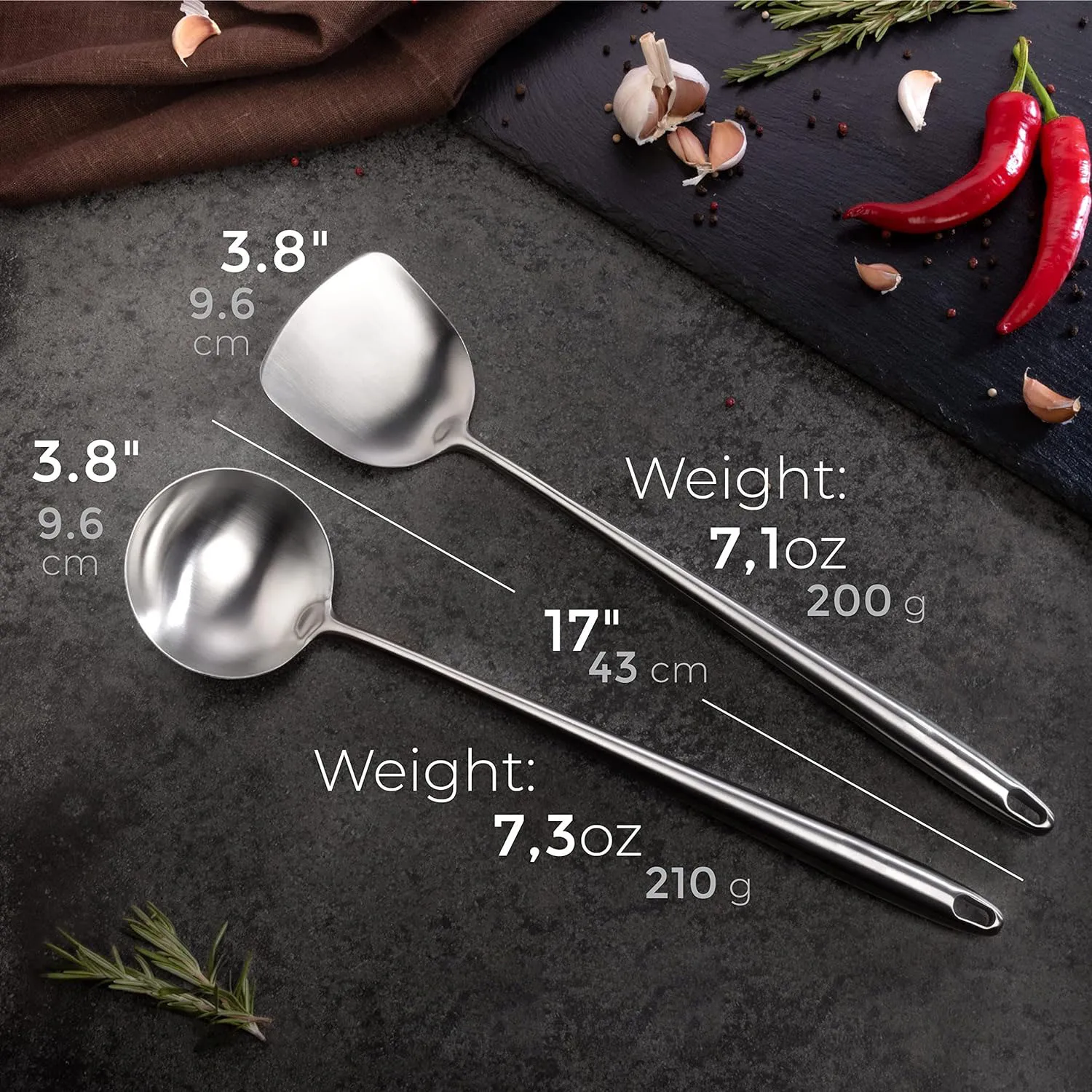 This set includes a 17-inch stainless steel spatula and ladle, designed for convenient cooking in 13-14 inch or larger woks. The long length ensures safety while cooking, keeping your hands away from heat.
